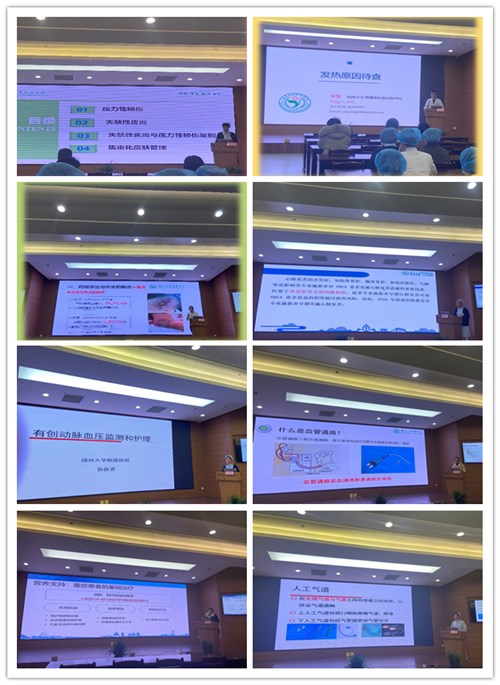 此次会议内容紧扣临床、干货满满,授课专家们从护理的角度出发,对临床常见的重点、难点问题,学科的前沿、新进展进行详细阐述。俞萍在会上使用大量的图片、文献,结合临床案例,生动详细讲解了压疮、失禁性皮炎的易患因素,临床如何正确的识别和处理,以及结合危重患者自身特点,如何运用SSKIN集束化护理策略,指导临床护理工作,从而解决临床难题;重症医学科副主任李勇讲授了发热待查相关的知识,他从发热的基本原理、常见引起发热的疾病分类、如何诊断患者发热,重点讲解了FUO的诊断流程,一定程度上给学员建立了科学、完整、严谨的临床思维,让大家更好地发现问题、解决问题;省护理学会静脉输液护理专业委员会委员韩荟护士长分享了药物外渗和渗出的应急处理,她结合最新指南,从概念、风险因素、预防措施、识别技能、处理措施以及临床外渗处理流程化等方面进行阐述;东区外科片区科护士长刘晓红就2020AHA心肺复苏指南进行专业的解读,分别从成人、儿童基础/高级生命支持、指南更新点,临床重点等方面做了详细专业的讲解;孙秋香、ICU主管护师吴艳、朱敏,从危重患者血流动力学监测、人工气道的管理、CRRT管路的护理方面进行了深层次的讲解;省营养专科在读护士、主管护师张晶,从营养专科护士的角度介绍了危重患者的营养支持以及如何去评估、实施。