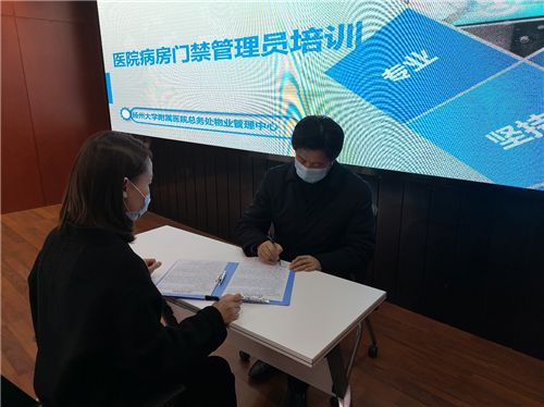 赵烨在会上重点从病区门关管控、管理员岗位工作要求和个人防护等3个方面对新员工进行针对性培训。她强调要杜绝门在人不在现象,工作中注意沟通方式,注意文明礼貌用语,禁止工作人员与患者及患者家属等出现语言冲突情况。张靖博希望新进员工在恒邦公司接下来的进一步培训中,迅速进入角色,通过各种渠道增加对疫情防控知识的学习了解。从思想上,意识到工作的严肃性;服务理念上,要有爱心、责任心;沟通方式上,要换位思考,注意技巧;在疫情防控标准上、工作纪律上和法律约束上,发挥主观能动性,以高标准做好门禁管理员工作,力争出现抗疫“明星”。王秋萍指出,医院把疫情防控的重要任务交给大家,是对大家的信任,希望大家一起把工作做好,圆满完成此项任务。张靖博代表医院与王秋萍签订了扬州大学附属医院疫情防控服务承诺书。