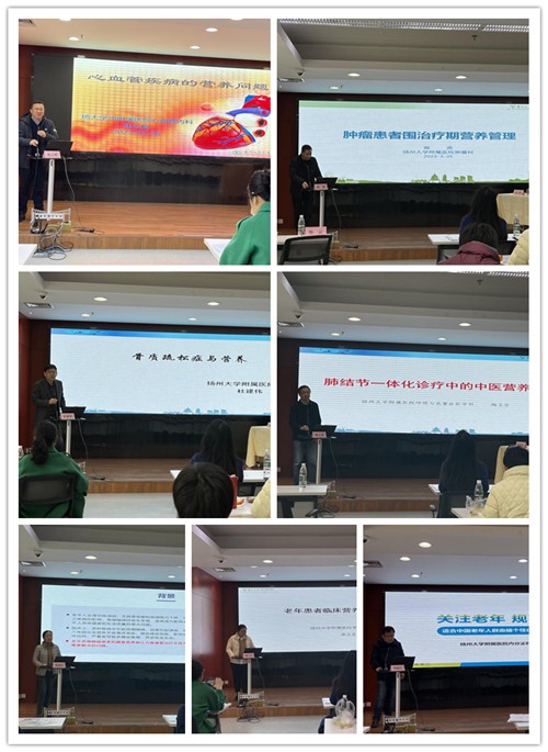 会上,多位省市内临床营养专家作内容丰富、精彩的学术讲座。江苏省医院协会临床营养专委会主任郑锦锋教授作“老年慢性肾病的饮食营养管理”讲座;江苏省人民医院临床营养科主任马向华作“饮食干预与糖尿病缓解治疗”讲座;淮安市第一人民医院临床营养科主任沈旸作“老年重症肺炎的营养策略与制剂选择”讲座;江苏大学附属医院临床营养科主任俞力作“老年认知功能障碍与营养”讲座。我院临床营养科首席督导包云、重症医学科主任刘微丽、教育处副处长焦云根、肿瘤科副主任陈勇、骨科副主任杜建伟、呼吸与危重症医学科副主任陶玉坚、神经内科副主任陶丽红、老年医学科副主任梁兰玉、内分泌科副主任医师李晓江分别作“中国居民膳食指南2022-老年人膳食指南的实践应用”“老年患者营养干预新进展”“老年衰弱与低磷血症”“肿瘤患者围治疗期营养管理”“营养不良与骨质疏松”“肺结节中西医一体化诊疗中的营养学”“老年吞咽障碍患者的营养管理”“心血管疾病营养问题”“关注老年 规范管理——中国首部老年糖尿病诊疗指南解读”讲座。讲座内容前沿、实用,涵盖老年医学和临床营养相关理论知识、临床实践经验和领域内的最新研究进展,参会代表积极互动交流,纷纷表示会将所学运用到实际工作中,为患者提供全方位更优质的诊疗服务。