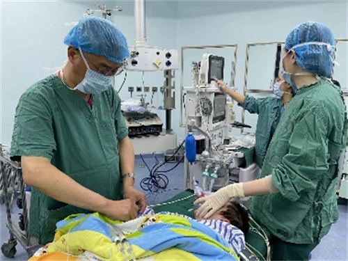 由于患儿基础病可能导致中枢性呼吸睡眠障碍,我院PICU副主任张利兵团队及耳鼻咽喉-头颈外科副主任汪峻峰团队综合评估后,考虑患儿存在混合性呼吸睡眠障碍。汪峻峰团队为患儿完善鼻内镜及支气管镜检查后发现其腺样体、扁桃体肥大,咽腔狭窄达90%以上,喉、支气管未见明显异常堵塞。团队讨论后,认为解除上气道梗阻可缓解低氧血症、高碳酸血症,与患儿家属充分沟通后,决定实施等离子腺样体、扁桃体切除,并完善相关术前检查。由于患儿要在危重状态下手术,麻醉要求高,麻醉科副主任张建友、主任医师孙建宏、副主任医师张静团队评估病情,拟定麻醉方案,为患儿实施麻醉。手术顺利完成,患儿安返病房,拔除气管插管,脱离呼吸机后呼吸平稳,二氧化碳值明显好转。
