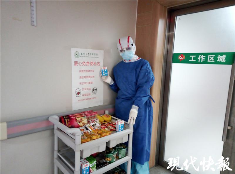 现代快报讯(通讯员 傅轩 记者 顾潇)3 月 6 日,在武汉市第一医院重症病区内,一个小小的 " 爱心免费便利店 " 开业了。原来这是来自扬州大学附属医院的队员们为了方便患者,参照武汉当地为医护人员提供免费便利店的做法,将便利店搬进了隔离病区。江苏援武汉医疗队队员林志娟说," 隔离病毒不隔离爱,我们一定要让武汉的患者感受到温暖!"