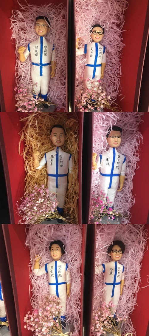 最后,田明祥和倪庆为19名援鄂英雄送上精心准备的礼物——穿着防护服的本人人偶,记录下他们难忘的时刻。