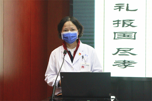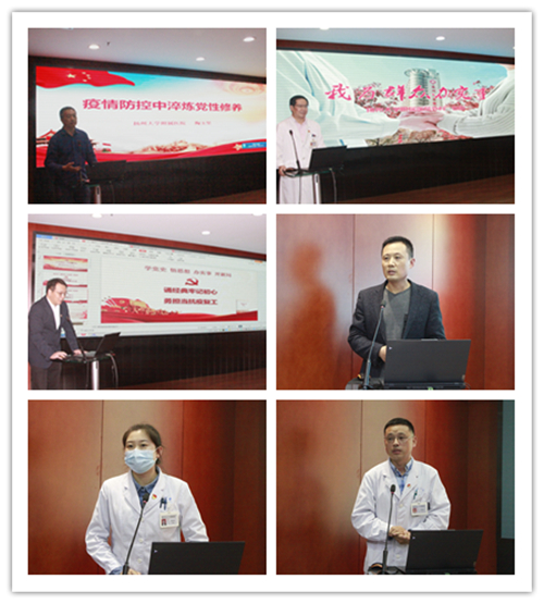 活动现场,大家齐声歌唱《公民道德歌》。学模范环节,内科党总支书记陶玉坚作“疫情防控中淬炼党性修养”报告,他结合自己在抗疫一线的经历,讲述了党性修养的深刻内涵,他说党性教育就是党员的自我教育、自我改造、自我完善,作为一名有着20多年党龄的老党员,责任和使命让他在危险面前无畏无惧、勇于担当;外科党总支书记包阳作“我为群众办实事”报告,制作精美的PPT、下沉基层的服务,他用一个个暖心的小故事告诉了我们在疫情中,作为一个基层党组织该怎样做,才能更好地为人民服务。