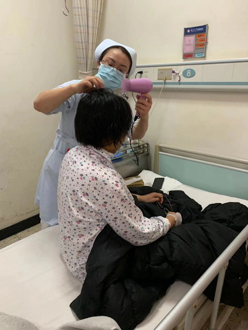 打水、洗头发、吹头发,一切井井有条。她们轻柔地揉搓着患者的头发。洗完后,摸着自己散发着清香的头发的患者露出了气管切开手术后的第一个舒心笑容。“谢谢,真的谢谢你们!”护士们拿着患者亲手写的纸条,与她相视一笑,温情在病房中脉脉流动。