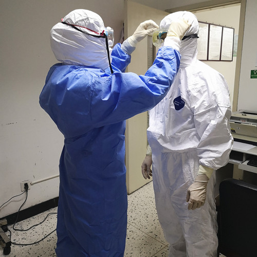在实验室P2区从事核酸提取的主任技师丁昌平和检验科检验医师林祥芳,从事的是最危险的环节,稍不留意就会接触到携带有病毒的气溶胶。绝对不能大意!两层防护服、N95口罩、护目镜、面罩、乳胶手套、防水靴套,每一个穿戴环节的不专业都可能给病毒“可乘之隙”。 为了早一分确诊,尽量当天出检测报告,尽快给临床反馈结果,他们从每天上午10:30收到当天集中送来的标本后就进入实验室操作,在密闭的PCR实验室不间断地工作。汗水浸湿了衣衫、护目镜被雾气遮盖看不清方向、脸颊被压出深深的印痕、鼻翼被磨得生疼、双手皱起无数纹路,忍受常人难以忍受的痛苦……5个多小时内,渴了没法喝水、饿了没法吃东西,紧绷神经、高度专注。每天从实验室出来时已是下午3点左右,这时候他们才能吃到同事中午帮助从食堂打来的早已冷透的盒饭。作为中心实验室的 “拆弹人”,丁昌平从正月初三开始就放弃休假、不畏风险、勇于担当,因为高强度的工作节奏,他口腔内长满了溃疡、牙龈肿胀,每天看着同事帮买回来的盒饭无法下咽。同在本医院工作的爱妻肿瘤科医生韩芳看到这种情况,心疼不已,每天早晨帮他准备流质带来,丁昌平就这样喝了一周余的流质,人也明显清瘦了。但他仍然每天加班加点、兢兢业业、无怨无悔,认认真真从事这这份令人“望而生畏”的工作。