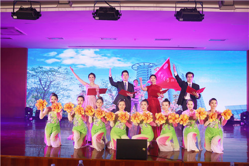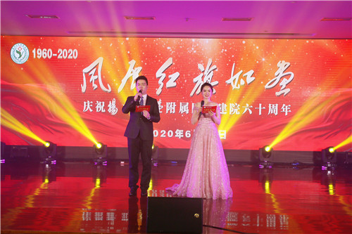 演出由周天祺、许思瑶主持。演出在开场舞蹈《我的祖国》中拉开序幕;一段大气磅礴的音诗画《风展红旗如画》回顾了扬大附院60年来的历史足迹,忆往昔、看今朝,赢得在场观众的阵阵掌声;音乐快板《说说我们的老前辈》,展现了扬大附院儿科这张王牌以儿科老专家周大博为榜样,与时俱进,承前启后,继往开来,永续发展的进取精神;在“书记访谈”中,院党委书记王炜对女承父业的周维克主任、附院CT之父吴克强主任、病理科岗位工龄之最的李家驭主任等3位医院老前辈代表,进行了访谈;情景短剧《拓荒者》再现了西区医院正式开业运行时的趣闻轶事,引得观众笑声阵阵;配乐演讲《知音》,再现了医院在21世纪之初,引进各类高端人才,提升了全院综合素质和核心竞争力,向冲刺三甲标准大大迈进了一步的“十大博士”行动;送医下乡,为农民朋友分忧解难,一直是扬大附院60年从未间断的义务和责任。消化内科近年来同乡镇卫生院结成医联体,开展给村民免费做胃镜检查等巡回医疗活动。民歌表演唱《春风春雨润农家》,由衷地抒发了广大农民的拥戴之情;60年来,医院在壮大自身的同时,积极响应国家号召,多次派出优秀医务工作者援外、援疆、援陕。援疆工作已进行了18年,共派出12名医生,跋涉4000多公里。男女声二重唱《花儿为什么这样红》甜醉所有参加过援外、援疆、援陕志愿者的心,给我们带来了天山雪莲似的圣洁青春;情景短剧《当未来照亮现实》再现了医院融入扬大,开启了医疗、教学、科研三结合、大发展的新征程的过程。科技之光照亮现实,也照亮未来,当我们眺望魔幻般的明天时,越坚定攀登医学科学高峰的信心。未来并不遥远,道路就在脚下;舞蹈《江海之恋》将扬州大学附属医院通过优势互补,相激相荡,资源整合的过程完美呈现。我们每个人都是这江海里的一朵浪花,每颗心都是这浪花里的一簇精灵;武汉封城,湖北告急,2020的早春如此令人揪心!像众多省份紧急派出医疗救护队星夜驰援一样,扬大附院先后四批志愿者组成援鄂抗疫医疗队,加入同新冠肺炎争分夺秒、捍卫生命的惊险战斗!抒情小品《呼唤》道出了全体抗疫医疗队员们的真实心声;扬州老乡、著名军旅青年歌唱家汤非,倾情演唱歌曲《我把健康托付你》《感动》,祝福扬大附院60华诞,并向我院抗疫勇士们表达真挚的慰问和敬意;演出在舞蹈《春之声》中落下帷幕。