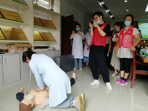 黄富宏为部分社区工作人员和普通居民做了药学知识讲座,西区急诊抢救室徐艳为社区居民做了心肺复苏操作演示。