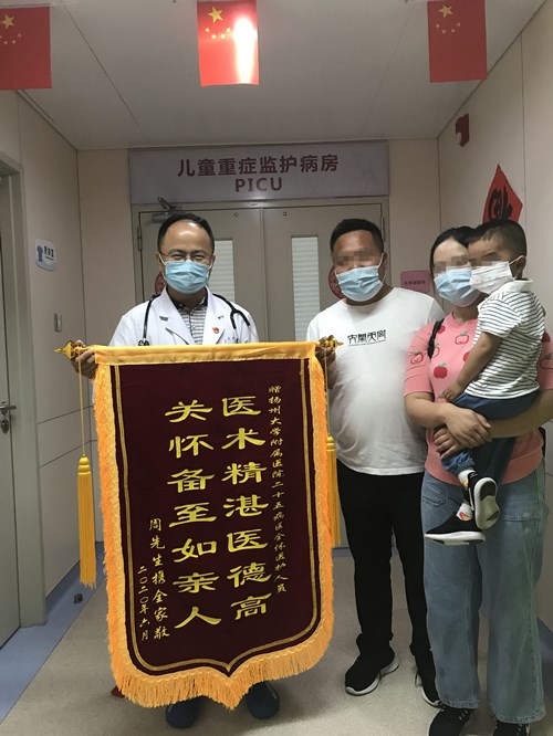 经过医护人员多日的悉心治疗与护理,患儿体温渐降至正常,腹胀好转,PICU医疗人员和刘振勇主任每日联合查房,患儿最新腹部立位片提示肠管通畅,给予复方聚二乙醇清洁灌肠,解出大量草绿色粘液便,渐渐转为黄色。经PICU医疗组一系列精准治疗方案的落实、儿外科的专业的查房指导、PICU护理组的精心护理、心理干预,患儿腹胀好转。医护人员拔除患儿的空肠引流管,缓慢从流质饮食改为半流质,继续予以抗感染、调节肠道菌群、保护冠脉、完善心脏彩超检查等措施,患儿体温渐渐恢复正常,无明显腹胀及腹痛等不适,已于近日康复出院。出院后,患儿家长向PICU送来了锦旗。