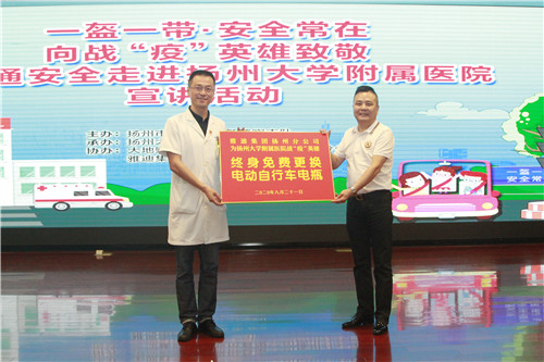 8月21日,扬州市公安局交警支队在我院西区医院第一学术报告厅举行主题为“一盔一带,安全常在”的交通安全宣讲活动,并向抗击疫情、奔赴前线的白衣天使致敬。同时,市公安局交警支队副支队长薛晓军、扬州大学附属医院党委书记王炜共同为“一盔一带”安全守护行动试点单位揭牌。