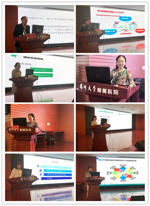 会上,我院多名具有丰富临床经验的专家进行了精彩授课。肾脏内科主任杨明作“淀粉样物质沉积性骨病”讲座;质控督导组首席督导金素萍针对血液净化感染风险进行了分析与思考;西区门急诊科科护士长王正霞分享了中心静脉导管的护理;肾脏内科护士长陆银凤分享了老年透析患者的安全用药护理;曹红梅详细讲解了血液透析器及管路的预冲;血液透析中心专科护士范春琴、胡春红分别作“血液透析上下机操作”“血液透析患者血管通路的维护”讲座。苏北医院血液净化中心护士长吉小静针对血液净化中心护理质控模式进行了深刻探讨。