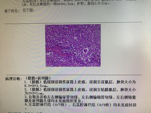 12月7日,在麻醉科严密监测下,范其兵团队为患者实施了腹腔镜下全膀胱切除术、输尿管皮肤造口术,以及盆腔淋巴结标准清扫,手术顺利,术后患者恢复良好。病理提示膀胱低级别浸润性尿路上皮癌,浸润至深肌层,盆腔淋巴结16枚未见癌转移,患者顺利出院。
