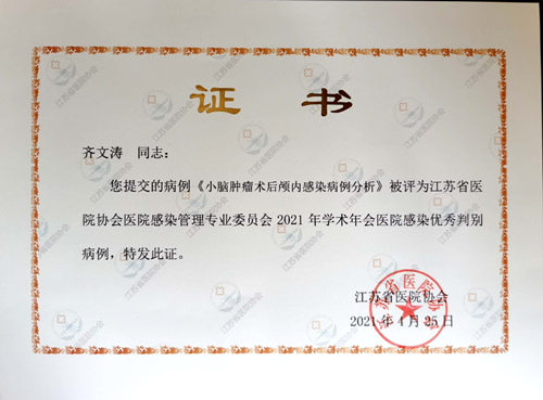 本次年会共征集全省医院感染判别病例100个,医院优秀感染判别病例16个,并在开幕式上予以表彰,其中前6个病例进行了大会交流。我院神经外科副主任、副主任医师齐文涛作“小脑肿瘤术后颅内感染病例分析”病例分享。江苏省人民医院重症医学科副主任医师李金海点评该病例的选择典型,代表性强,鼓励临床医师与感控专职人员加强互动,关注院内感染防控在感染病例中的价值体现。
