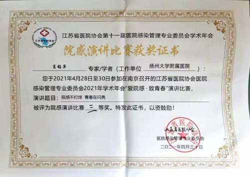 日前,由江苏省医院协会主办的医院感染管理专业委员会2021年学术年会在南京召开,年会中举办了“爱院感·致青春”青年演讲比赛和医院感染判别病例演讲竞赛。