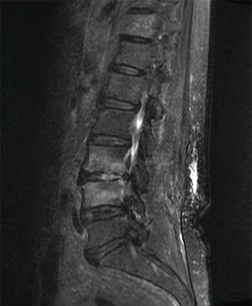 第一步,“活下去”,把感染彻底控制住。在仔细研究患者的影像学资料并得到手术室的配合后,杜建伟团队决定立即为患者实施微创脊柱内镜技术,清除腰椎感染病灶,并将双腔管置入感染的腰椎间隙内,细管给予敏感抗生素,粗管引流,成功做到感染病灶精准靶向给药,同时配合静脉滴注敏感抗生素,全身与局部协同治疗。术后第二天,患者的腰痛症状就明显缓解,血液炎症指标也有明显下降,并随着时间推移,指标逐步恢复正常。