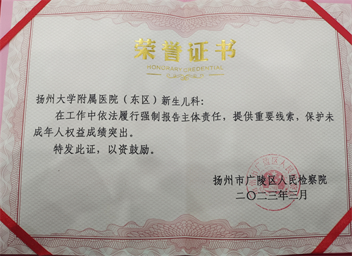 3月22日,在市广陵区人民检察院举办的“检爱同行——强制报告六进专项宣讲活动”首场报告会暨表彰会上,扬州大学附属医院东区医院新生儿科受到表彰,表彰其在工作中依法履行强制报告主体责任,提供重要线索,协助工作,在保护未成年人权益方面的突出成绩。