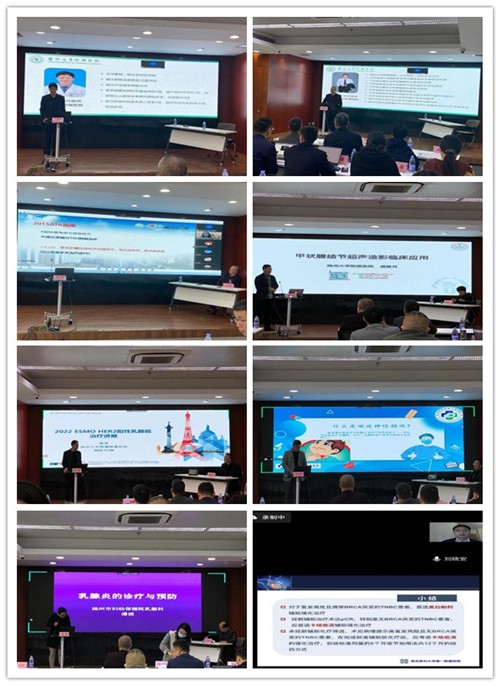 会上,多名专家作形式多样、内容丰富的精彩讲座。江苏省抗癌协会甲状腺癌专业委员会主任委员、南京医科大学附属肿瘤医院头颈外科主任张园,中国抗癌协会乳腺癌专业委员会委员、江苏省人民医院普外科副主任、乳腺病科主任刘晓安以及我院肿瘤科副主任陈勇、首席督导童建东,超声科主任戚庭月、副主任於晓平等专家进行线上、线下授课。扬州市其他医疗机构甲乳外科专家在会上和大家作经验分享。讲座内容涉及甲状腺肿瘤诊断及治疗中存在的不足以及相应的解决措施、喉返神经监测技术在甲状腺手术中的应用、甲状腺结节超声造影技术在临床中的应用、乳腺恶性肿瘤的最新诊疗进展以及乳腺炎的诊疗规范等。