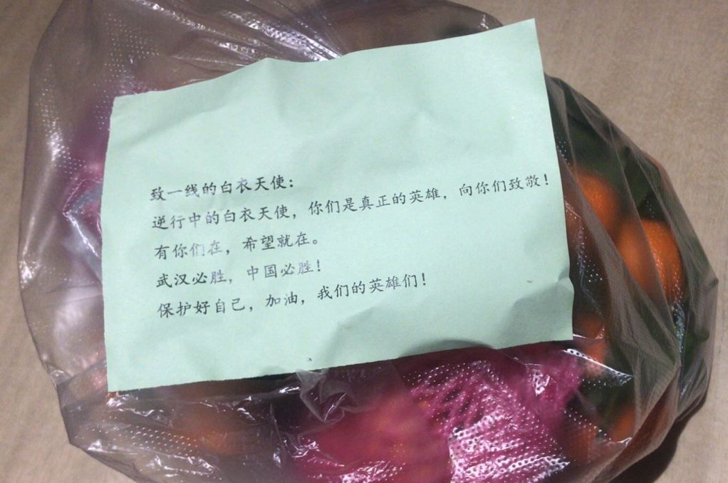吴天姿接过水果,发现里面还有一张小纸条,上面写着:“致一线的白衣天使,逆行中的白衣天使,你们是真正的英雄,向你们致敬!有你们在,希望就在。武汉必胜,中国必胜!保护好自己,加油,我们的英雄们!”