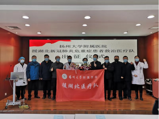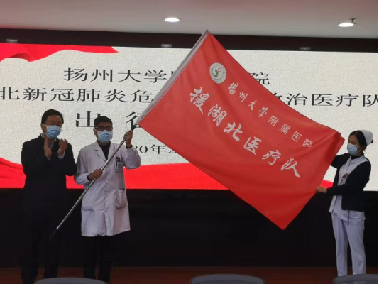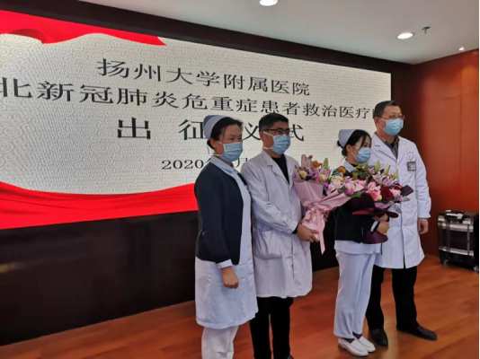 中国江苏网讯 (记者黄镇)2月2日上午,扬州大学附属医院为两位即将增援武汉的医生护士举行出征仪式,当天下午,该院呼吸与重症医学科副主任医师邵向荣和重症医学科护师、共产党员李娟娟就将出发,加入江苏援湖北医疗队前往武汉抗疫一线。
