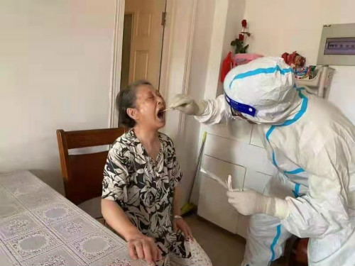 8月5日,扬州主城区启动第三轮全员核酸检测。在奥园观庭采样点,我院医务人员应社区要求,为行动不便的老弱病残群众和居家隔离的人员上门采集核酸。神经外科副主任医师段晓春已经在采样点连续工作了6个多小时,仍然主动请缨,上门为梅岭街道邗沟社区10余名群众采集核酸。整个过程耗时两个多小时,他穿着厚重的防护服,骑着电瓶车,顶着烈日来回穿梭。居民中有中风瘫痪在床的,有年事已高行动不便的,也有因为有新冠肺炎患者次接触史而隔离的,段晓春不顾疲劳,一家一家、一层楼一层楼奔波着。有位居民住在7楼,爬到7楼后,段晓春已经气喘吁吁,缓过神来后,他仍轻柔细心地为居民采集核酸,离开时再对环境进行消杀。汗水湿透了他的衣背,裤腿里能倒出水,虽然很累,但是居民告别时的连声道谢,让他觉得再苦再累都值了!在游泳健身中心采样点,同样有一些行动不便的居民需要上门采集核酸。8月5日下午5点以后,前来采样点做核酸检测的居民相对少了一些。队员骨科主管护师赵雯在社区工作人员的带领下,前往慧享福长者照护中心和御和苑北小区,为老年居民采集核酸。养老院都是老年人,有的卧床、有的行动不便、有的有心理障碍,不是太配合,采集起来也比较困难。赵雯克服困难,为养老院的老人和工作人员共采集56份核酸。随后,赵雯又前往御和苑北小区采集2份核酸。绿杨新苑采样点的麻醉科副主任护师吴晨小组7人先为小区二期的居民采集了近5000份样本,之后接连又奔赴一期支援战友工作,而一期采集量巨大,有近8000个,但他们没有人喊苦叫累,都在岗位上坚持着。小区内有一养老院,考虑到里面多为出行不便的老人,且失能率较高,连同院内员工共有80余人。为确保采样全覆盖,针对老人身体抵抗力较弱、出行不便的实际情况,他们短暂休息后,便决定抓紧时间上门采样。养老院老人行动不便、张口困难,但他们依然怀着爱心和耐心,一边真诚地安慰老人,一边积极引导他们配合采样工作。在采样的同时,他们还积极宣讲疫情防护知识、生活健康常识,增强老人的科学防护意识,并鼓励他们树立信心。养老院的老人、护理人员纷纷表示,上门服务真的很暖心,令他们很感动。