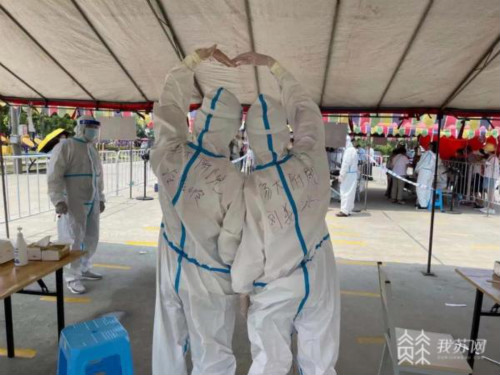 2021年7月31日14:00,扬州主城区按下暂停键……当天夜里两点钟,附院接到了第二批次支援全市核酸采集的任务,大家辗转反侧,终于天亮了。一行186名医护人员迅速被分成的若干小队,奔赴一个个战场。小组的队长是位援鄂回来的杨明,他刚毅的脸庞总是让人觉得那么踏实。陶丽红和王英歌两位主任医生,都是科内技术骨干、顶梁柱,她们温柔的言语总是让人觉得那么亲切。大家去的是扬州嘉境采集点,一下车,城北街道卜杨社区工作人员就已经早早的来接应我们了。来的负责人,皮肤黝黑,声音沙哑,反复地说:“有任何需要,直接告诉我!防护用具、消毒用品、防暑药品、水、食物均已准备!”采集点是在室外,黄色的封条中交错着放着三张桌子,桌子上整齐的放着试管、条码、手消液......贴心的工作人员还在每张桌子的旁边放了一台电风扇,瘦西湖风景区的志愿者们都已经准备好手机,引导排队的人员扫码,做好核酸登记;居民们按防疫的要求排着队,他们中,有抱着小孩的,有推着轮椅的,有拄着拐杖的,大家都静静的等着,没有抱怨,没有争吵,这就是理解和支持,我们很幸运!大家迅速换上防护:“我们先上,三个小时替换。”“要不我俩先上吧,你们刚下的夜班。”杨明大手一挥:“没事没事,我们先上!”同事间的支持与担当,我们很幸运!两个多小时,高热酷暑,汗水早已浸湿了防护,大家踉踉跄跄的回了,头晕,便在桌子上趴了一会儿。其余的人继续奔赴前线,穿好防护服,麻利地采着核酸1,2,3,……100……200……防护服里只感到一条条水线划过身体,来采核酸的人脸上全是汗水,衣服也被浸湿了,社区人员也给居民们分发了水,提醒着大家注意防暑。在采集的过程中,听到最多就是,“你们真的太辛苦了”“谢谢你们”“太感谢了”“你们真了不起”“宝贝,将来做医生好吗?就像他们一样”……人间有你们,大爱才无疆!